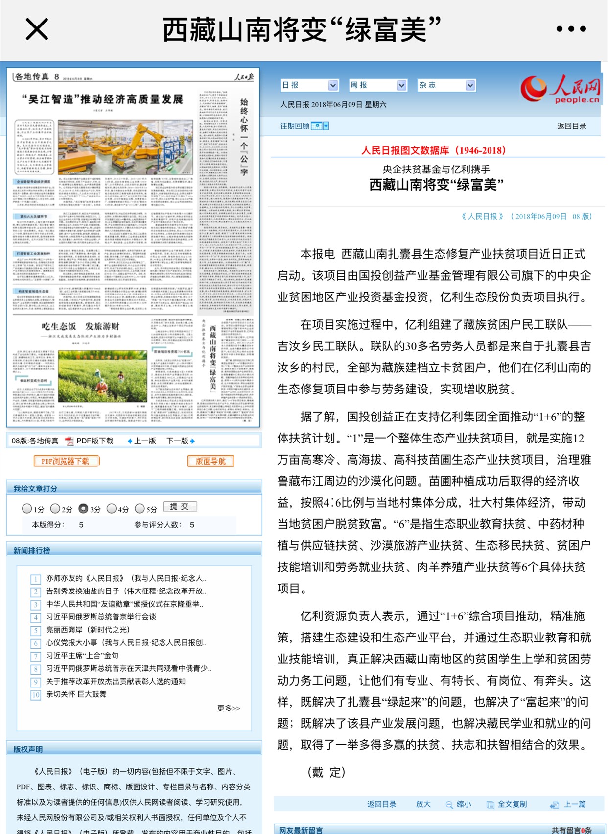 人民日报:《央企扶贫基金与亿利携手 西藏山南将变“绿富美”》